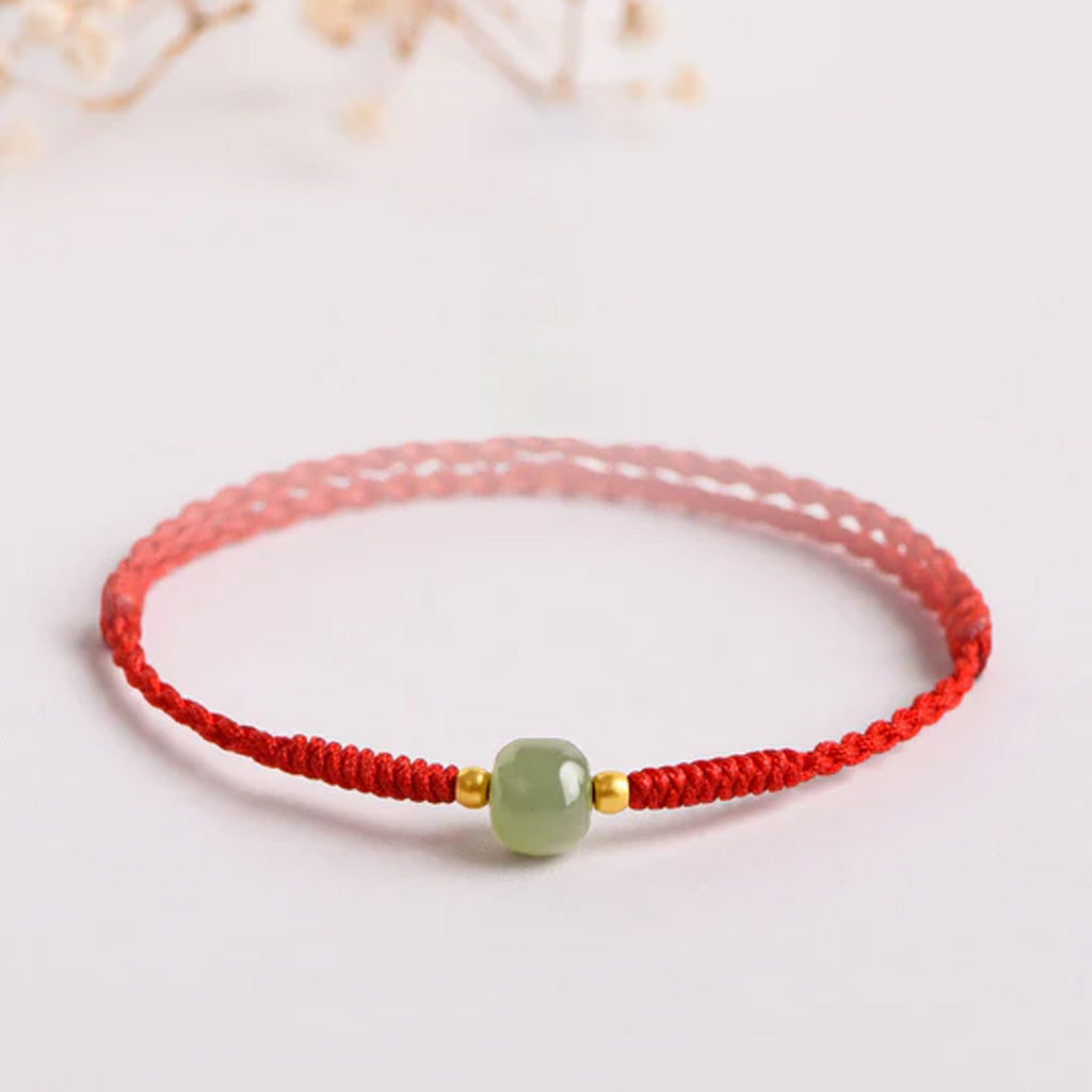 This beautifully handwoven bracelet combines a vibrant red string with a smooth, jade-like barrel bead — a design that embodies both energy and serenity. The red cord is often seen as a symbol of protection and vitality, while the polished bead adds balance and refinement.