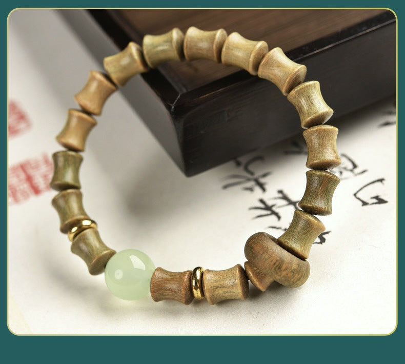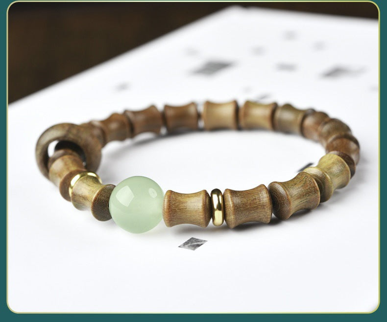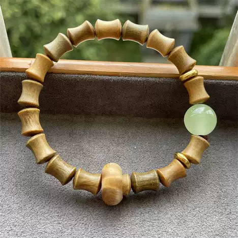 This strand features eco-finished green santal beads from sustainable forests. Each bamboo-jointed unit cycles between honey-amber (indoor) and moss-green (sunlight) – a photochromic phenomenon grounded in natural science.