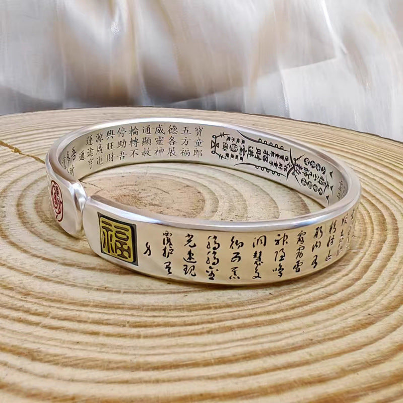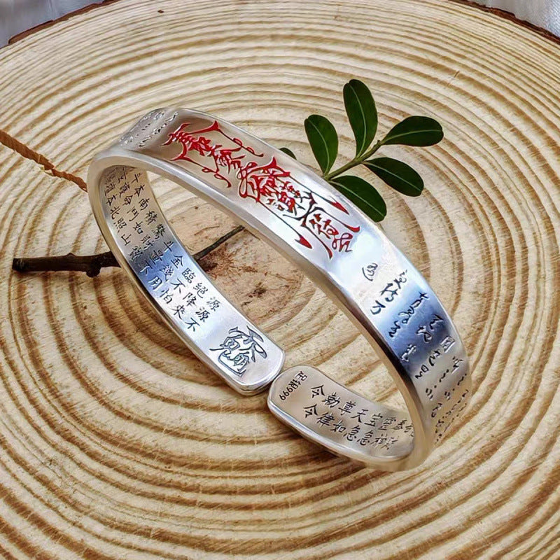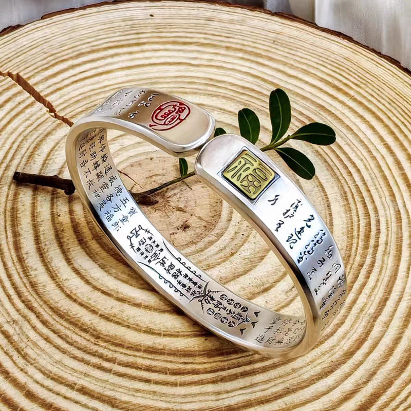 The silver-grey titanium bracelet is engraved with pure black Taoist mantras and vermilion runes, integrating the essence of "I listen to the sacred determination of my heart" from the Tao Te Ching. Each stroke carries thousands of years of wisdom, and in the collision of the cold light of metal and the black spell, it awakens the mysterious guardian power of the East.