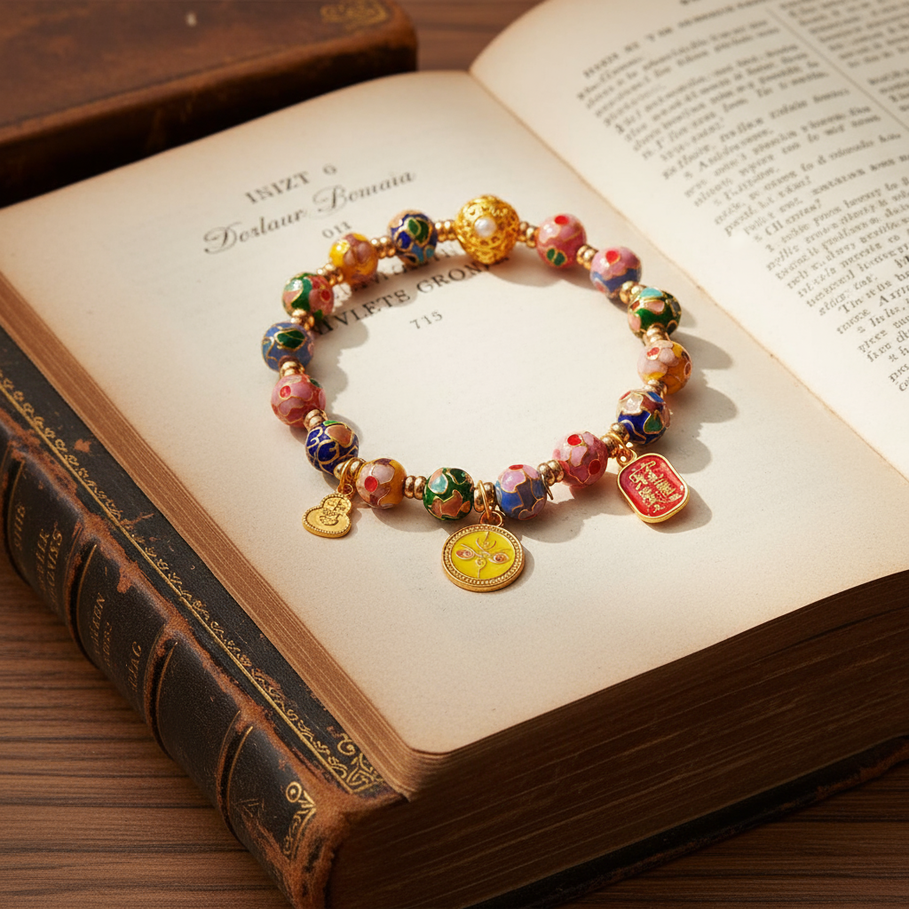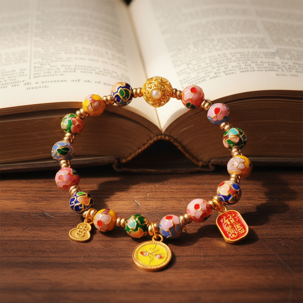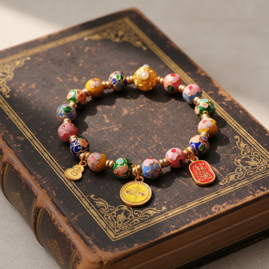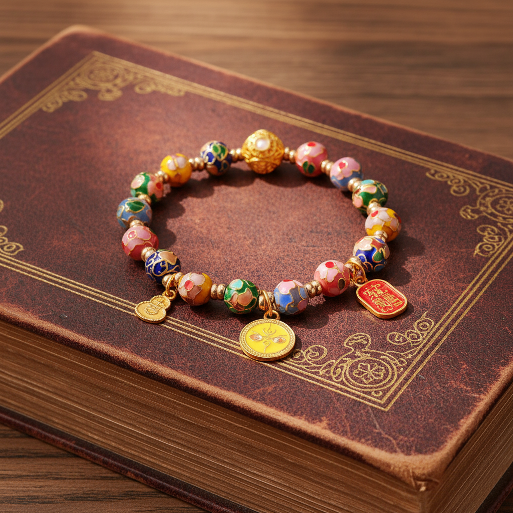 This bracelet combines traditional cloisonné enamel beads with symbolic representation of the Yellow God of Wealth, regarded in culture as a guardian of prosperity and abundance.