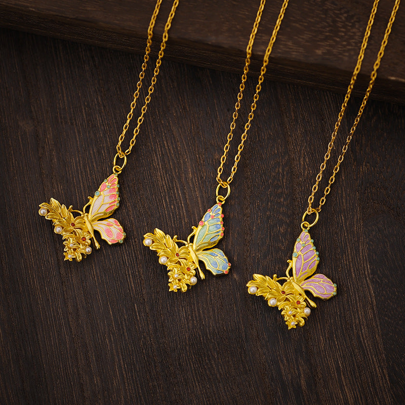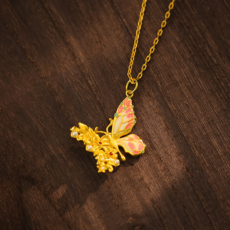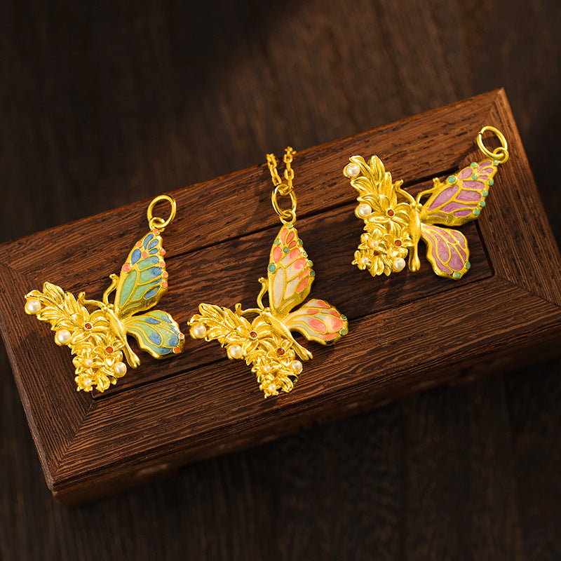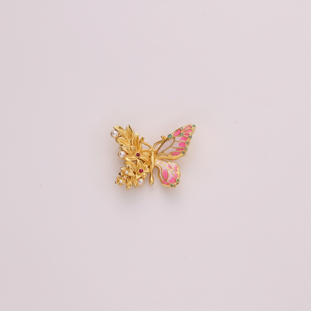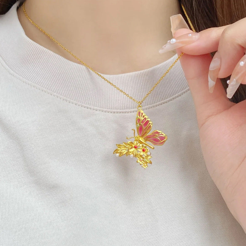 This butterfly pendant is delicately crafted with golden filigree, showcasing exquisite craftsmanship and a shimmering finish that evokes the beauty of “dancing light.” The butterfly, celebrated across cultures as a symbol of transformation, freedom, and vitality, is here reimagined in a radiant gold-plated design. With its intricate detailing and luminous surface, the pendant captures both the elegance of traditional filigree work and the modern appeal of refined luxury. Whether worn as a statement piece or as a subtle token of grace, this pendant embodies both cultural meaning and fashionable sophistication.