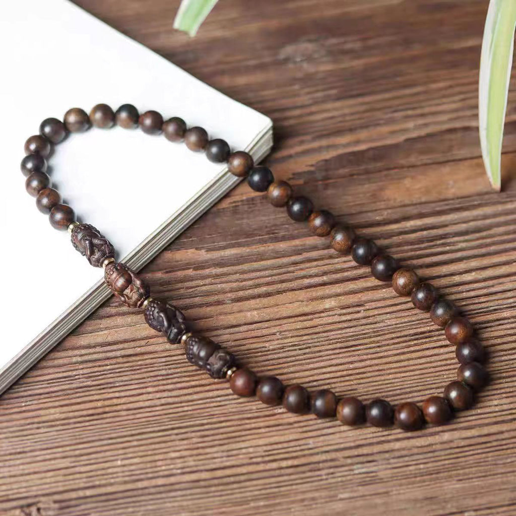 Hand‑carved from naturally aromatic agarwood, this double‑wrap bracelet features four intricately carved "Four‑No‑Evil" Buddha beads — each representing a timeless lesson of mindfulness — combined with smooth agarwood beads for a balanced aesthetic and comfortable wear.