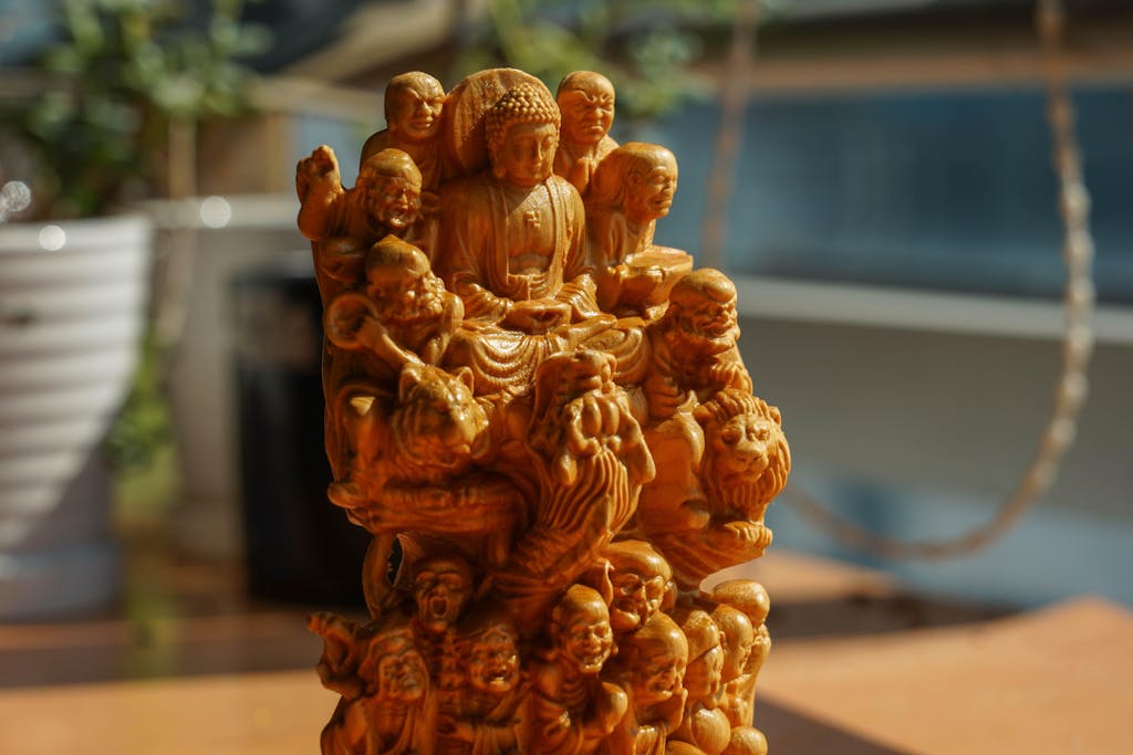 This handcrafted wooden statue brings together the Eighteen Arhats—legendary disciples known for their courage and protection—with the serene presence of the Buddha. The scene portrays iconic acts such as Dragon‑Taming and Tiger‑Subduing, symbolizing the triumph of virtue over adversity.