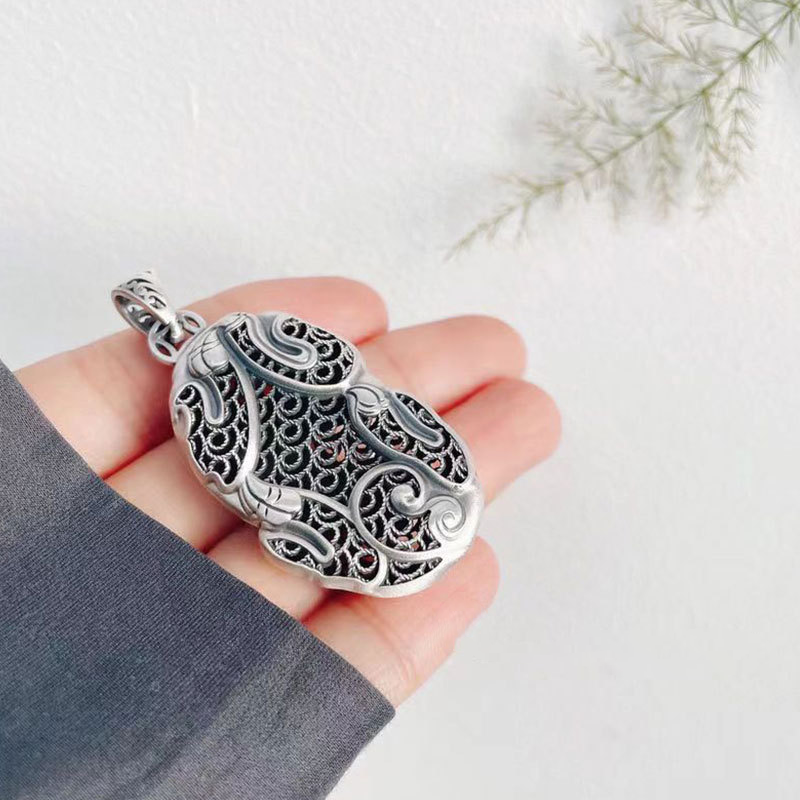 This intricately hollow-cut pendant reflects both strength and sacred flow, allowing light to pass through its open design as a symbol of energy in motion.