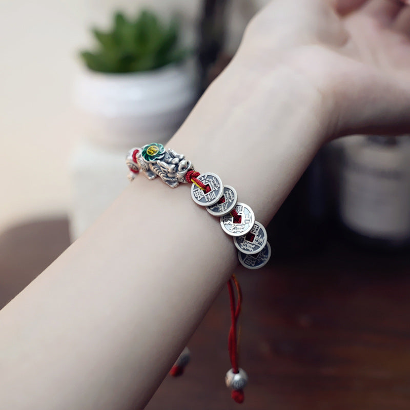 "Centered by a silver Pi Xiu—legendary creature believed in Chinese culture to devour misfortune and attract prosperity—this bracelet integrates five authentic replica coins of Qing Dynasty emperors (Kangxi to Qianlong). Each coin bears historic inscriptions, symbolizing the Five Emperor Coins’ tradition of warding off negative energies and inviting abundance. Detailed beadwork with engraved patterns complements the guardian beast, while dual sliding clasps allow customizable fit. A wearable heritage piece merging mythic symbolism with historical gravitas."