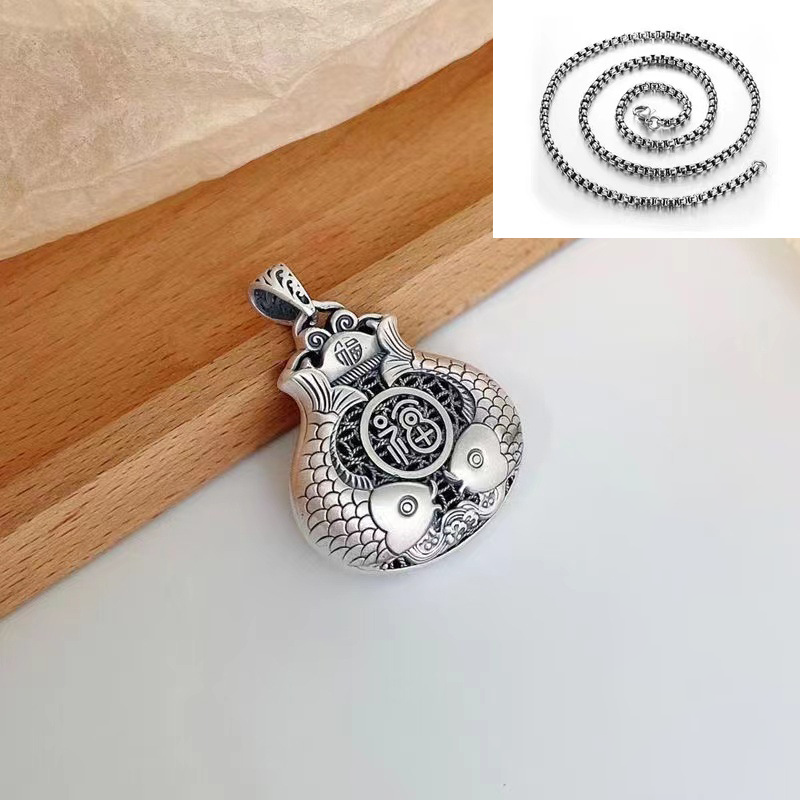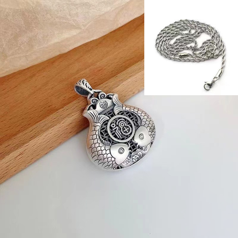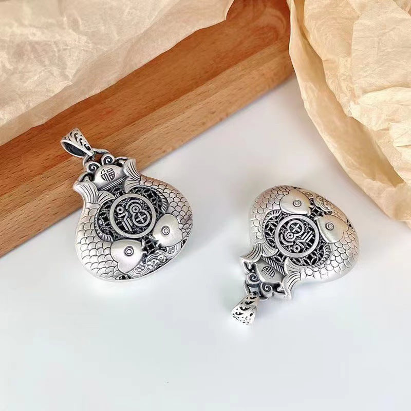 This elegant hollow-cut pendant features two graceful fish encircling a traditional fortune bag, a powerful symbol of luck, abundance, and spiritual harmony in Eastern philosophy.