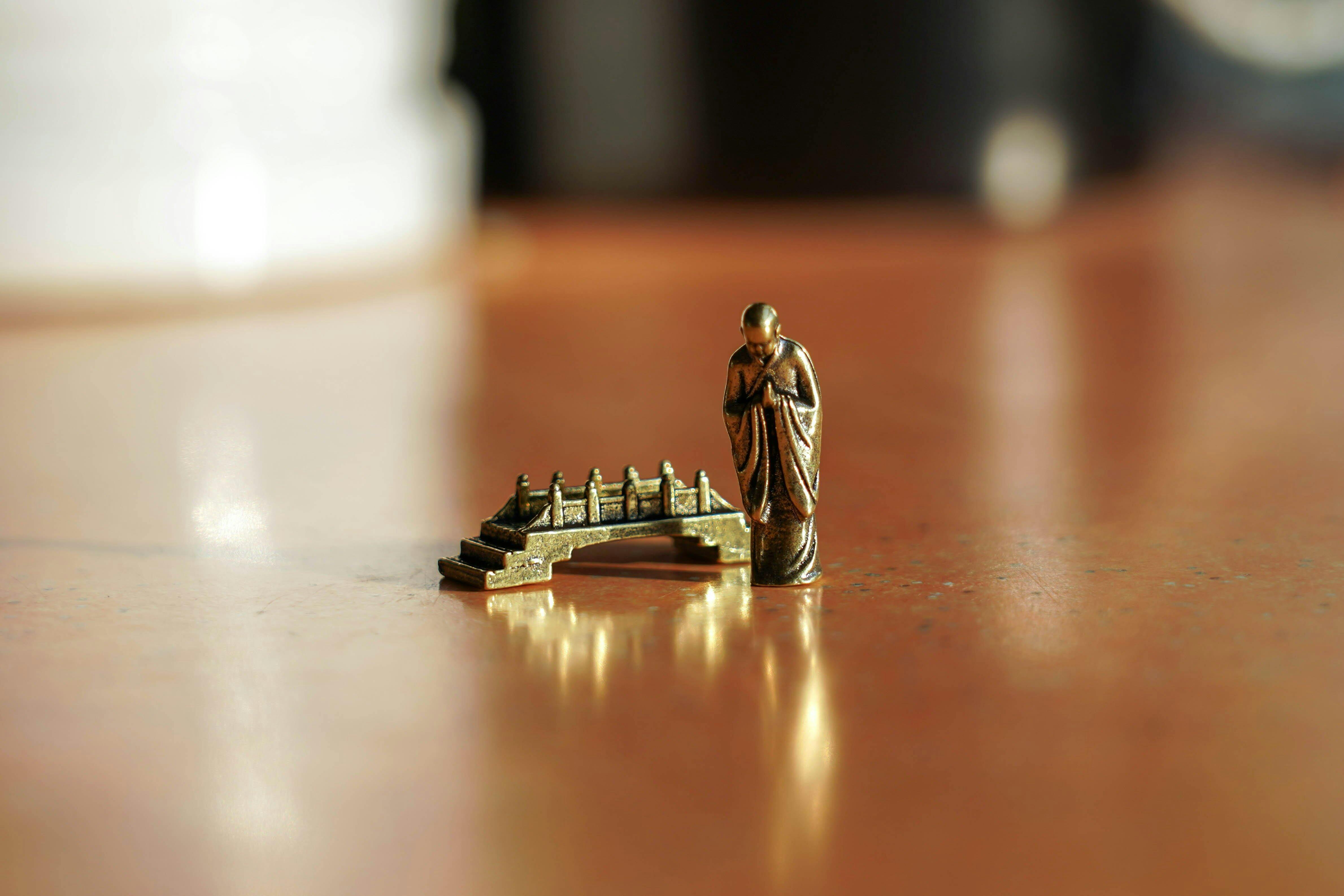Mini Brass Figurine Set – Saluting Buddha, Luoyang Bridge Scene, Little Monk & Fishing Old Man | Zen Ara Grove