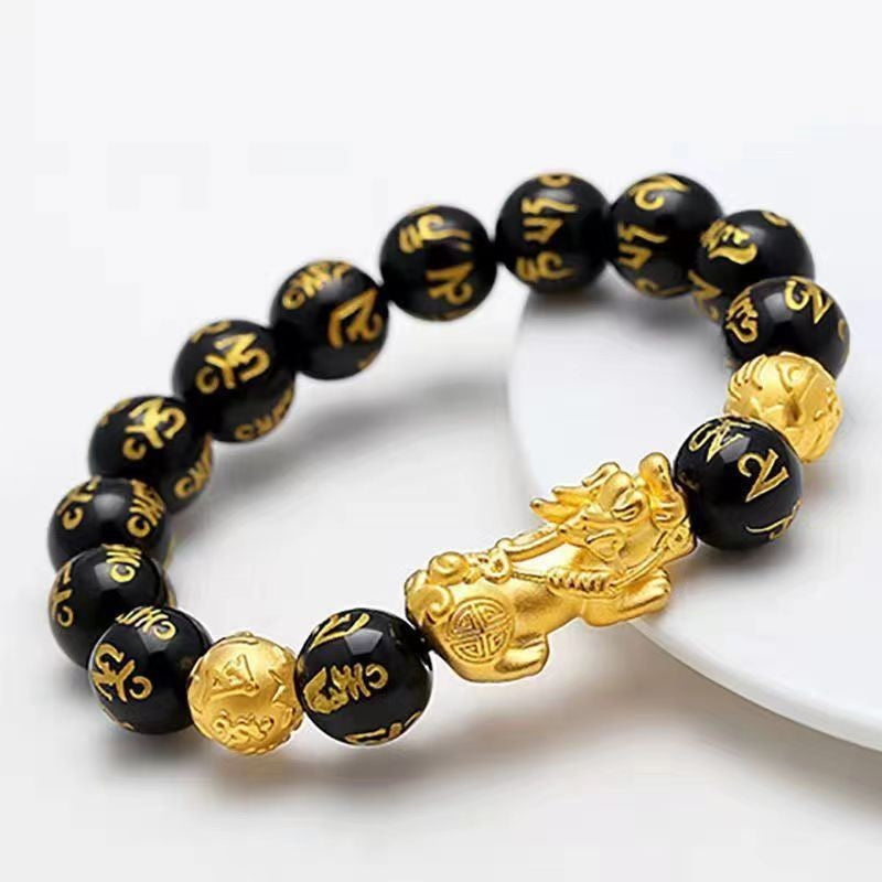 Hand-strung with deep black onyx beads etched with ancient prosperity motifs, this bracelet centers a fluidly cast PiXiu – a mythical guardian in Chinese lore symbolizing fiscal resilience. Gold hieroglyphs on each bead trace timeless wisdom for mindful abundance.