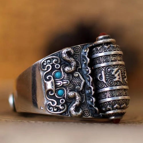 The Six-Syllable Mantra Silver Ring is engraved with the sacred Buddhist chant “Om Mani Padme Hum”, a symbol of compassion, protection, and enlightenment deeply rooted in Tibetan tradition.