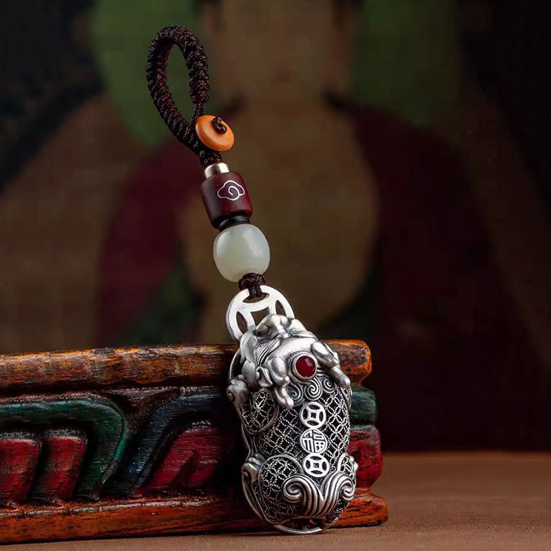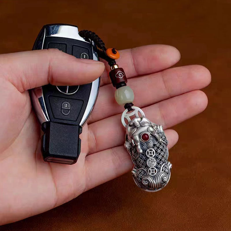 Pixiu Wealth-Attracting Keychain with Gem-Encrusted Silver