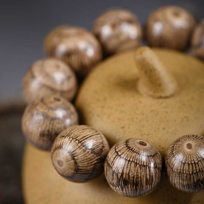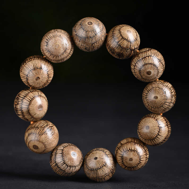 Crafted from wild rattan burl wood, each bead embodies a distinctive "eagle-eye" pattern – dark grain rings surge like river currents, converging into a natural pupil. Warm brown wood glows with golden undertones, accented by vermilion spacer beads that ignite vitality against the pure black backdrop.