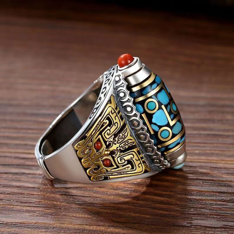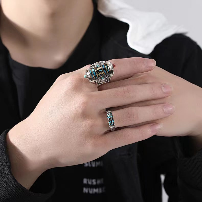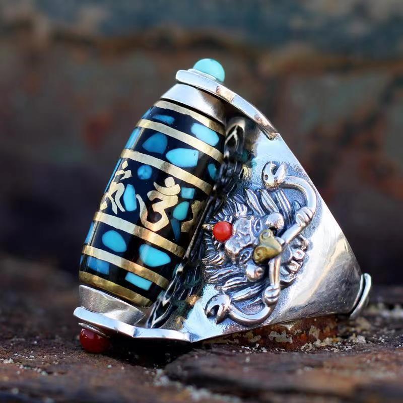 Spinning Mantra Ring - Rotating Prayer Bead with Turquoise & Guardian Beast