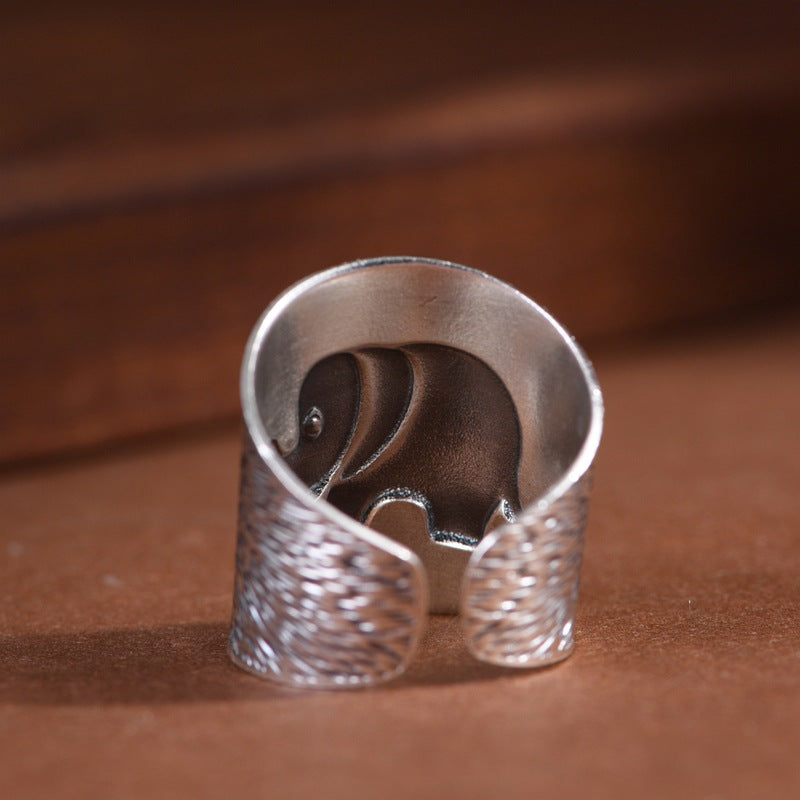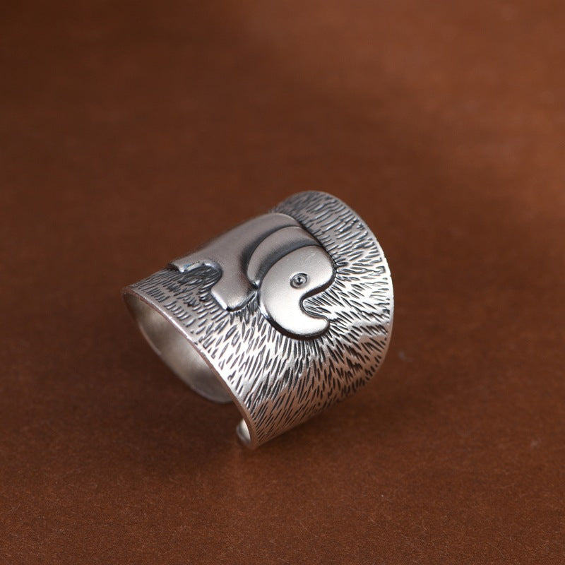• Design – Wide hammered band featuring an elephant motif, symbolizing luck, strength, and wisdom.