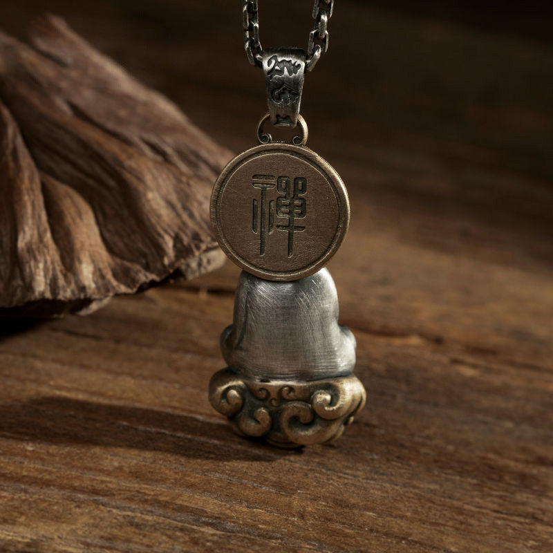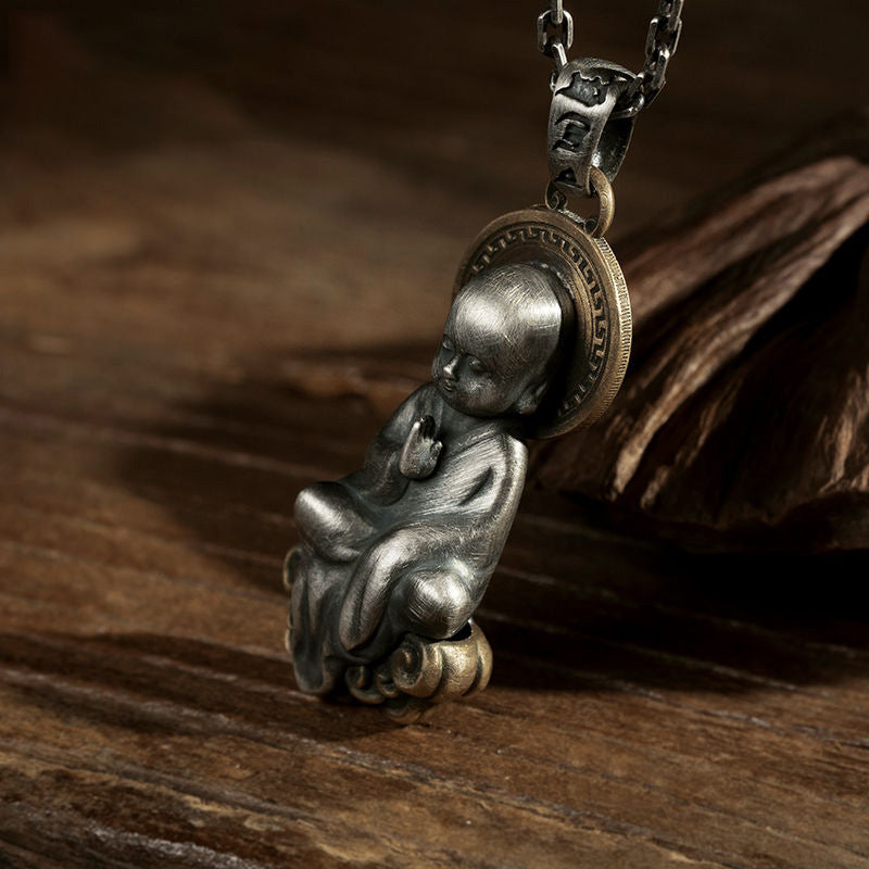 Crafted in sterling silver, the pendant depicts the seeking-blessings child Sudhana in deep meditation atop auspicious clouds. With closed eyes and prayerful palms, the figure is haloed by a dual-tone mandala etched with sacred motifs. The bold chain contrasts with the polished pendant, while withered lotus pods in the backdrop evoke Buddhist parables - a talisman uniting spiritual symbolism with artisanal mastery.