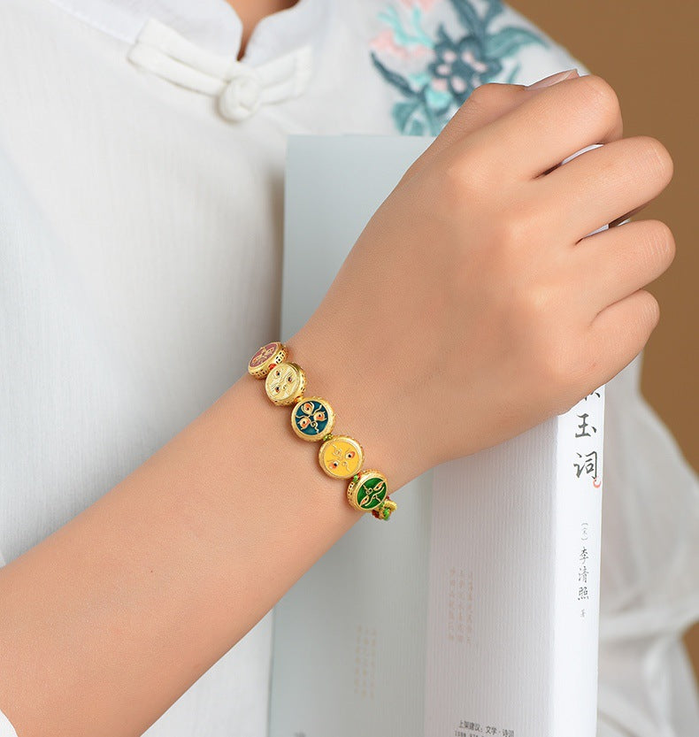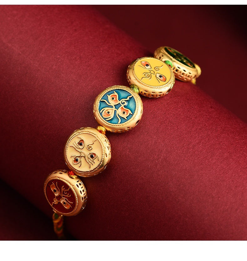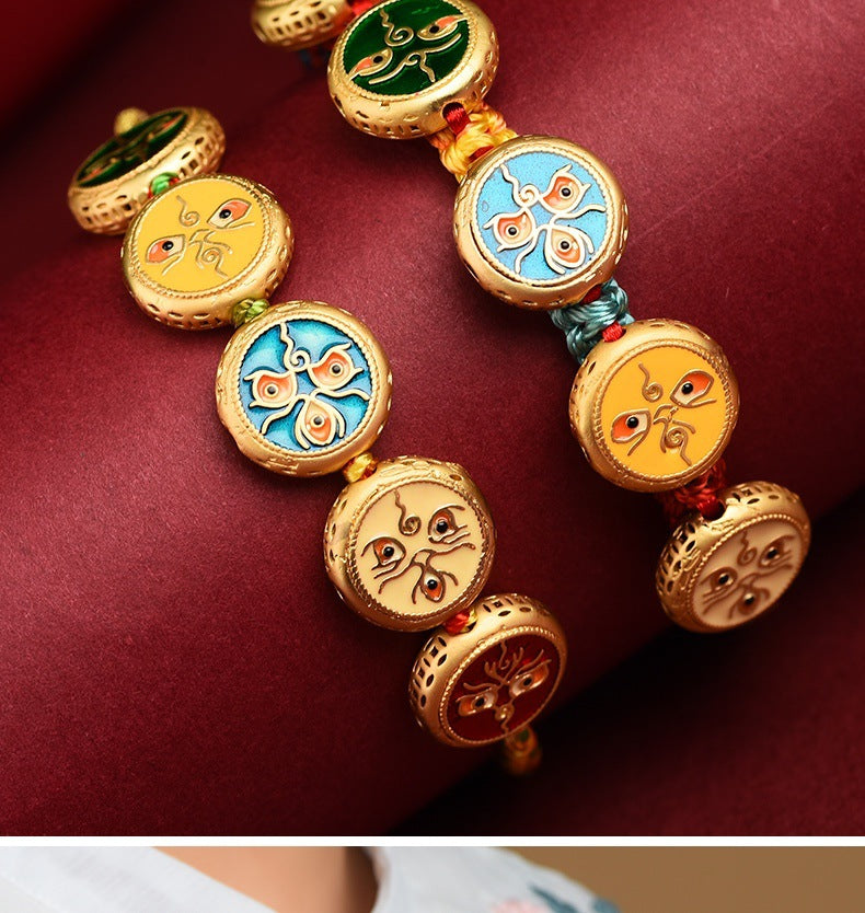 Handwoven with vibrant silk threads in rainbow hues, this bracelet features five ornate gold orbs embossed with sacred eye motifs. Each colorful bead – crimson, emerald, sapphire, sunshine yellow, and sunset orange – carries the ancient wisdom of Tibetan symbolism, believed to harmonize spiritual energies in daily life. The intricate knots represent life's interconnected journeys, while the central metallic charms add subtle sacred geometry. Wear it as a reminder to seek balance through changing seasons: when colors dance on your wrist, let them anchor you in mindfulness. More than an accessory, it's a portable meditation on abundance – not just material, but the richness of perspectives.