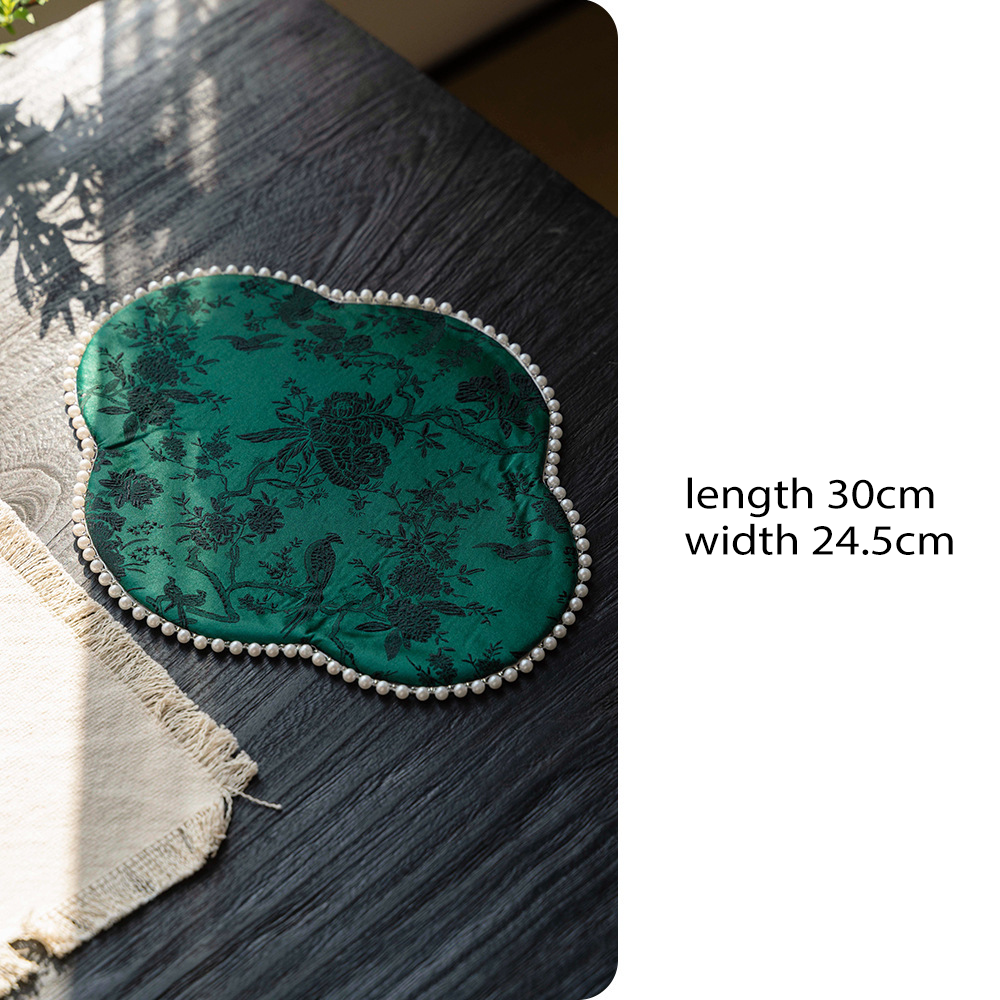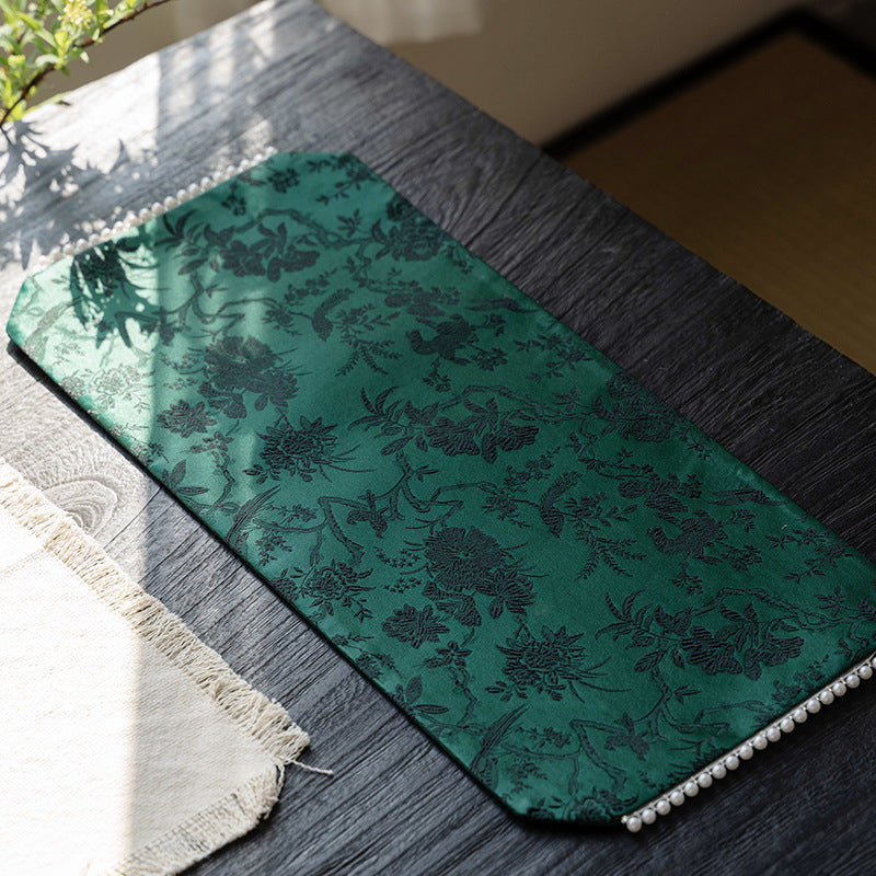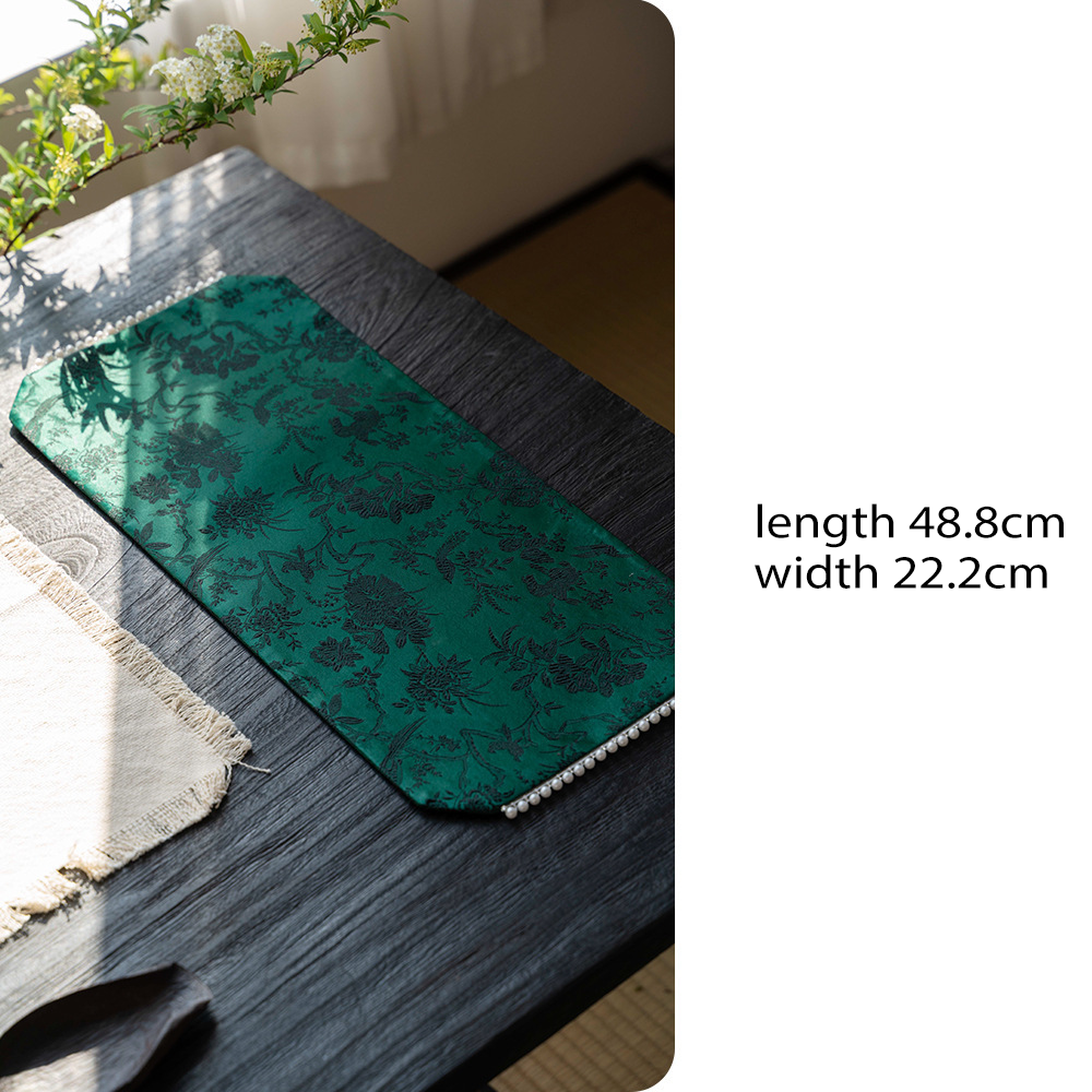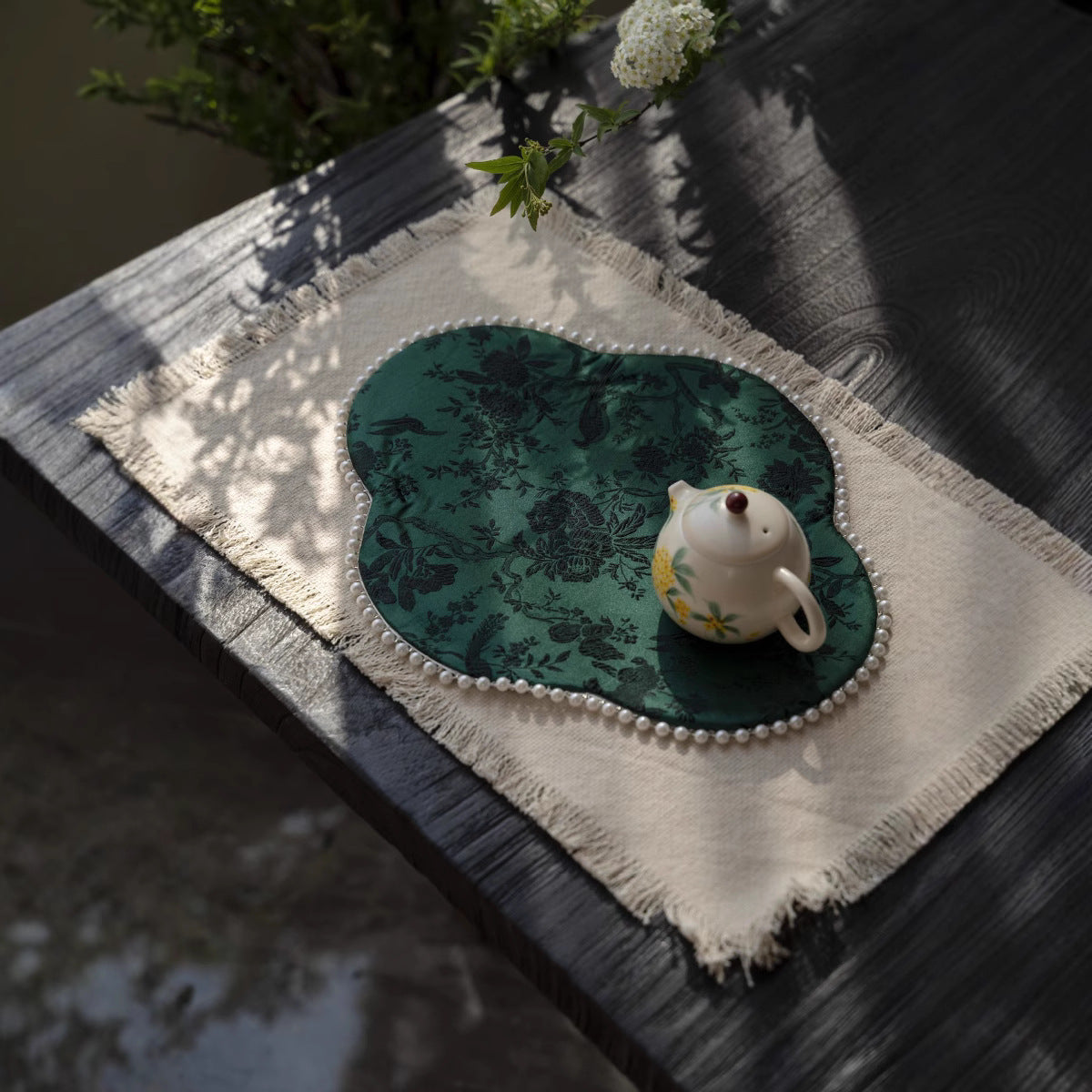 Crafted from thick jade-green brocade with irregular, cloud-like patterns, this tea ceremony mat embodies wabi-sabi aesthetics. The hand-stitched white tassels fringe its edges, creating soft movement as steam rises from your teapot. Sized to hold essential tea tools (shown with white pot), its textured surface anchors your ritual in tactile serenity.